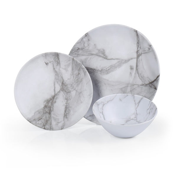 Conjunto de loiça em melamina Marmor, com decoração elegante tipo mármore e acabamento mate. Conjunto para 2 pessoas composto por 6 peças.