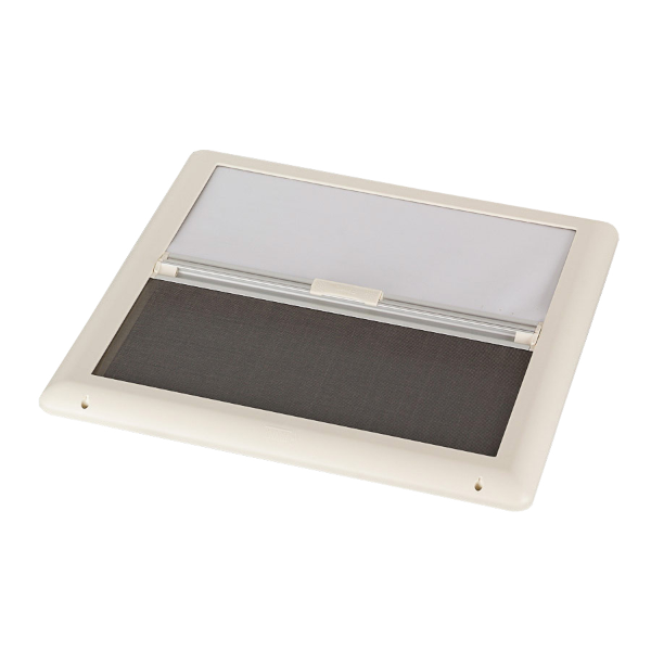 Sistema rolo com estore opaco e rede mosquiteira adequado para clarabóia Fiamma 50×50. Ventilação permanente graças às entradas laterais.