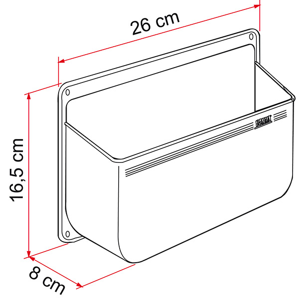 Prateleira Fiamma Pocket L multiusos em plástico resistente a arranhões, fácil de instalar com os parafusos fornecidos.