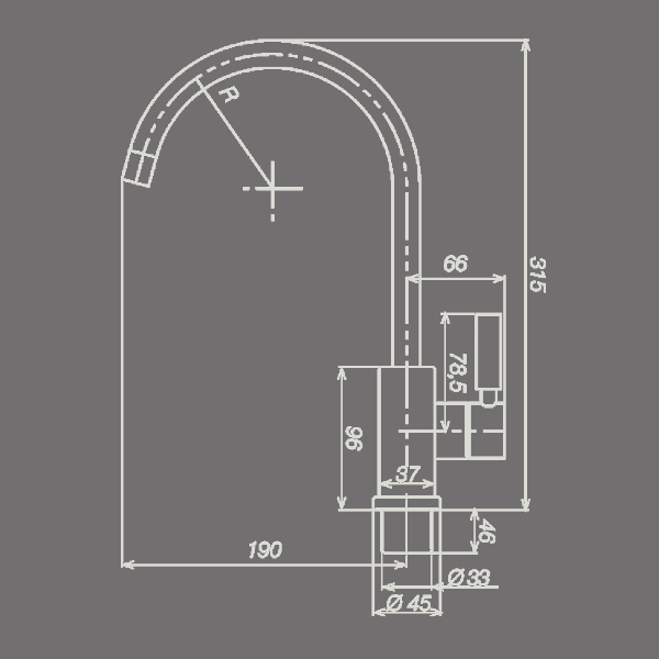 Medidas: Comprimento Bico(Centro): 190mm, Raio do Bico: 90mm, Altura do Bico: 230mm, Altura Total: 315mm
